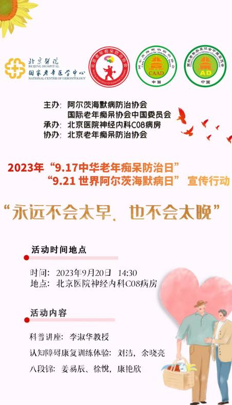 每年9月是“世界阿尔茨海默病”月,北京医院神经内科参加了由阿尔茨海默病防治协会、国际老年痴呆协会中国委员会、北京老年痴呆防治协会主办的大型公益义诊活动。今年的主题是:“永远不会太早,也不会太晚”,9月20日下午在北京医院内科会议室开展了相关主题的公益活动。