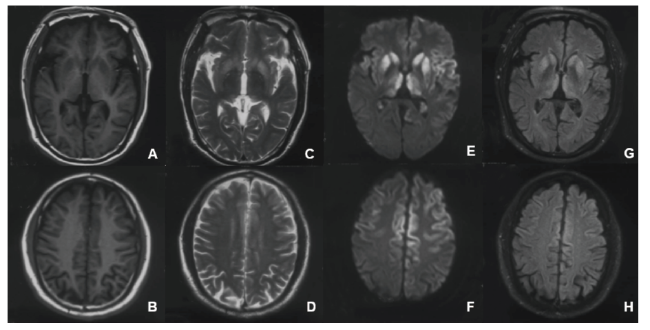 图1 患者颅脑MRI平扫A、B)T1轴位,C、D)T2轴位,E、F)DWI轴位,G、H)FLAIR 轴位,示双侧基底节、丘脑、额顶叶皮层多发对称性异常信号。Fig.1 Patient Brain MRI scan A、B) T1WI axis,C、D)T2WI axis,E、F)DWI axis,G、H)FLAIR axis,Multiple asymmetric signals in bilateral basal ganglia, thalamus and frontal parietal cortex |